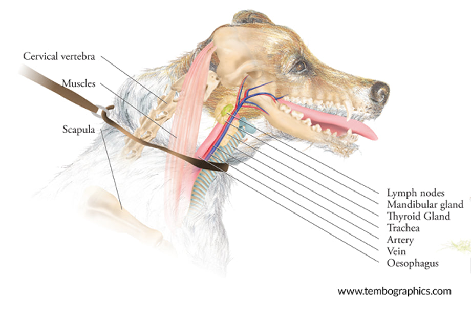 Dogs have delicate structures in the neck. These include the trachea, larynx, thyroid gland, cervical vertebrae, and major blood vessels. When a dog pulls, or when the handler accidentally jerks the lead, the collar absorbs the force directly in this area.